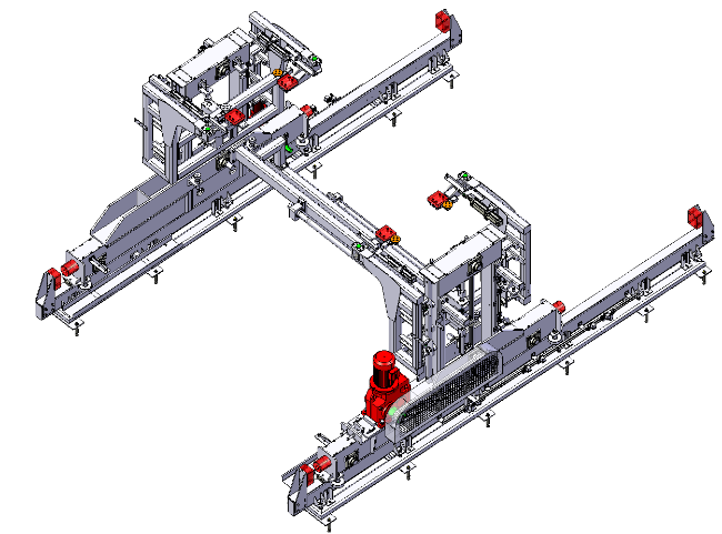 車身下線轉載系統通常包括下線升降機、車身轉載設備及一些輔助的定位機構和車身吊具打開機構等。其中的車身轉載設備是構建該系統的核心。它具有兩種輸送設備間的承接功能,需要滿足較高的節拍,并根據需求具有同步輸送功能,可實現X,Y,Z三個方向的動作,對載重也有較高的要求。