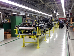 該工廠的生產(chǎn)節(jié)拍為35JPH,是北京奔馳汽車用以生產(chǎn)GLA車型的工廠。合裝線的合裝和擰緊采用半自動的設備,工藝裝配要求和安全級別較高。該工廠合裝線高度還原了奔馳在匈牙利工廠的設計,同時保證了原有合裝裝配工藝,得到了客戶的肯定。