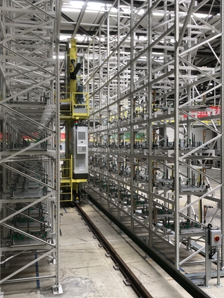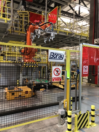 該項目構建了分托盤在分裝線 - AGV合裝線 - 分托盤立體庫區 - 分裝線這樣一個封閉的環線,并由滿載托盤空中自動轉載站、空托盤機器人自動轉載站、滾床輸送線、高速堆垛機、升降機、分托盤與滑橇的自動拼裝站等轉載設備完成關鍵的串聯,進而保證了整個系統的完善、高效和高度自動化。