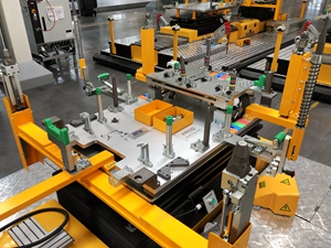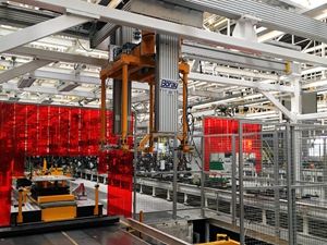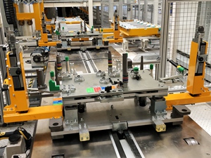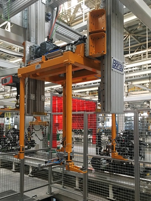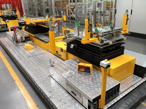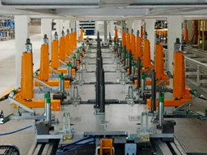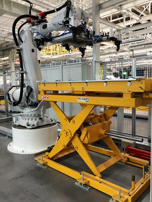 該工廠的生產(chǎn)節(jié)拍為40JPH,主要用以生產(chǎn)S300/S500/S700車型。分托盤采用多車型兼容性設(shè)計,配置有切換機構(gòu)和插拔銷結(jié)構(gòu),設(shè)計形式較為復(fù)雜。空托盤轉(zhuǎn)載首次采用了機器人+氣動抓手+視覺識別系統(tǒng)的設(shè)計應(yīng)用,穩(wěn)定可靠。